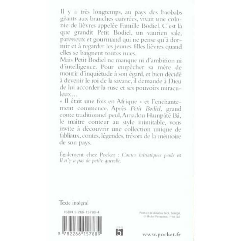 Il y a très longtemps, au pays des baobabs géants aux branches cuivrées, vivait une colonie de lièvres appelée famille Bodiel.c'est là que grandit petit Bodiel, un vaurien sale, paresseux et gourmand qui ne pense qu'à dormir et à regarder les jeunes filles lièvres quand elles se baignent toutes nues. mais petit Bodiel ne manque ni d'ambition ni d'intelligence. pour empêcher sa mère de mourir d'inquiétude à son égard, et bien décidé à devenir le roi de la savane, il demande à dieu de lui accorder la ruse et ses pouvoirs miraculeux...